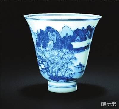 这件造型优美典雅的铃铛杯,是康熙官窑的杰作,它最早出自1999年的香港苏富比(微博)拍卖会。由于胎体雪白轻盈,整个杯子薄可透光,造型为撇口深弧,显得分外玲珑秀巧,釉水晶莹剔透,青花发色具有康熙青花的特点,鲜明轻快,明媚如洗,画面展开宛如一幅名师大家的山水手卷。