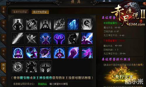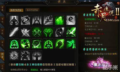 点击龙王佣兵的图鉴,即可打开图鉴界面。技能图鉴分为普通技能图鉴和高级技能图鉴,收集不同级别的龙王技能均可提升主人属性,获得龙王系统专属称号。当激活12个普通技能图鉴,即可获得“驯龙高手”永久称号;激活12个高级技能图鉴,可获得“龙行天下”永久称号。