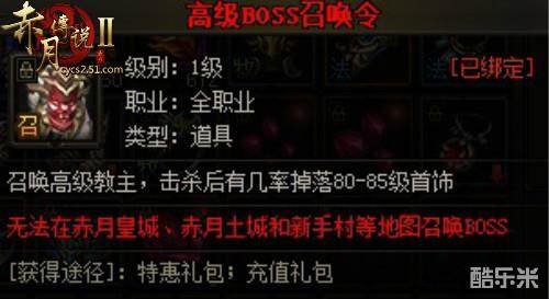 我们来看看这款“高级BOSS召唤令”,无法在赤月皇城、赤月土城和新手村等地图召唤BOSS。召唤高级教主,击杀后有几率掉落80~85级的装备。51《赤月传说2》传说中普通的BOSS召唤令也不能在这些地图召唤,只能选择在迷失之城使用。