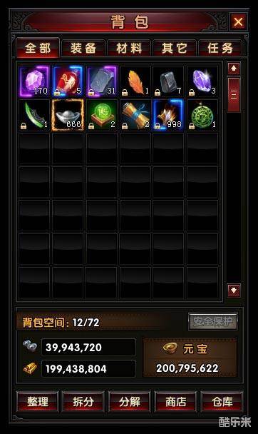 背包用于给玩家存储装备、材料、道具等,提供分解、拆分、便捷购买/出售、仓库存储等功能,同时略微增加战斗力