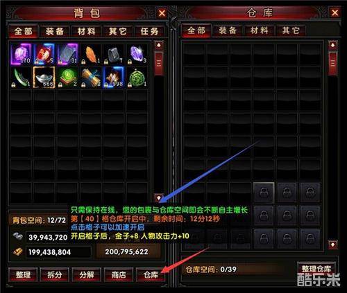 每个格子会给玩家提供一定的金子和攻击力。玩家也可使用元宝快速解锁背包/仓库格子
