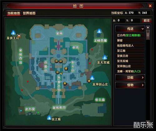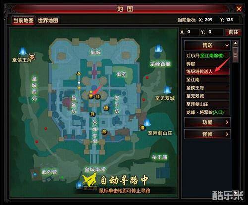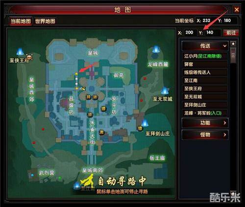 地图显示玩家当期所在场景的平面地图,场景中的功能NPC、怪物以及地图传送点,并提供NPC提示与选路功能