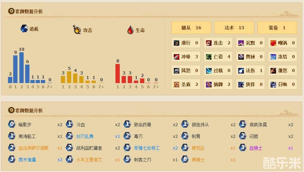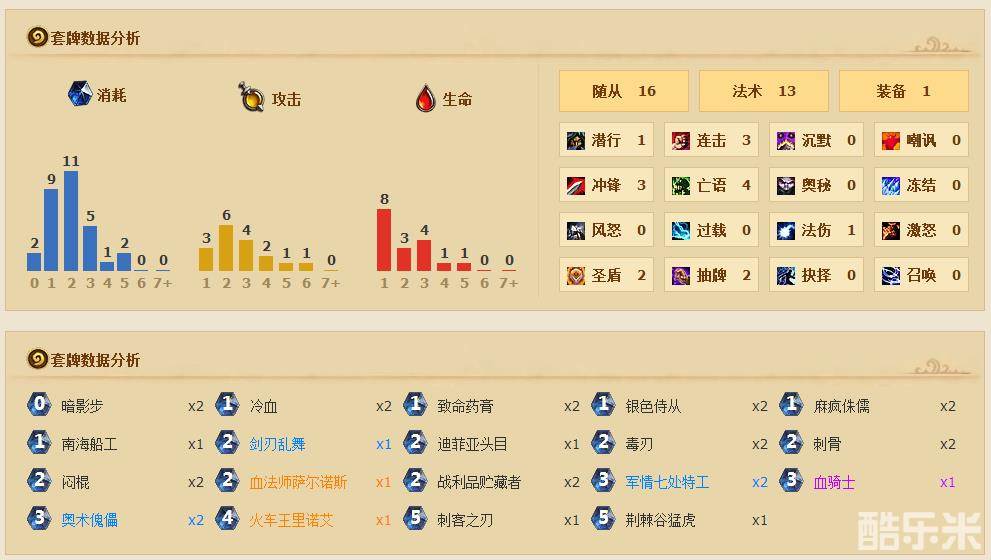完全放弃防守,基本不解场全力冲脸的玩法,暗影步配合冲锋随从使得斩杀线高得吓人,非常犀利的速攻玩法。