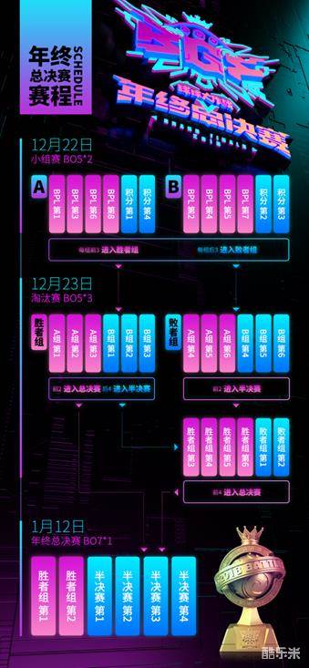 赛制方面,今年BGF回归了杯赛赛制,整个赛程缩短到3天时间,更加胶着紧凑。12月22日-23日,12支战队将经历小组赛、半决赛2天、3轮、25场高强度比赛,争夺进入决赛的6张门票,最终1月12日压轴大戏上演,最终决赛将见证冠军的诞生。