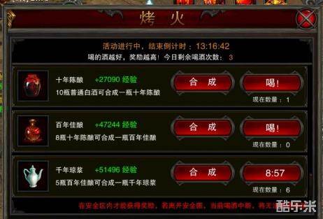 白酒也可以进行积攒,在积攒到一定程度后,就可以通过烤火点来进行兑换更高级的白酒,增加烤火所获得经验,喝白酒时因的种类不同,效果将会被顶堤,请注意。
