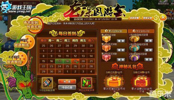 3、园游会签到拥有补签功能,若玩家错过当天签到,则按照漏签顺序,依次进行补签,价格100金币;
