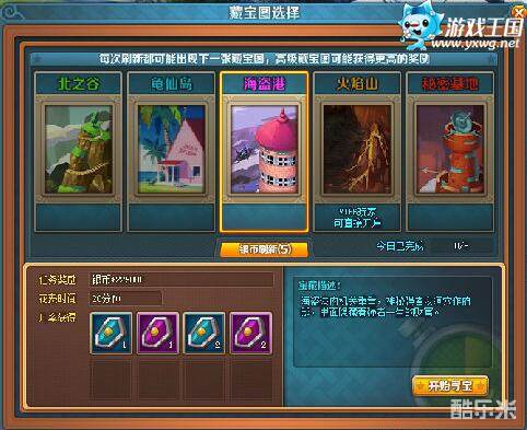 每次寻宝,玩家有5次银币和10次金币的刷新次数,利用这些次数来获得更高品质的藏宝地图。
