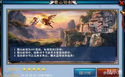 活动开启时,35级以上玩家在屏幕中央弹出“蜀山论剑”开启面板;(活动开启的一刻主动弹出)