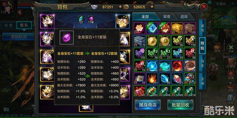 11月的更新时,宝石套装属性有了很大程度上的提高,从11级宝石套装开始,宝石套装开始拥有百分比属性,每升一级均能获得更高的百分比套装属性。达到15级宝石套装可获得物理攻击:+1200、法术攻击:+1200、物理防御:+1200、法术防御:+1200、最大生命值+18000、物理防御:+15%、法术防御:+15%,不管是攻击还是防御上都会有很大的提升。