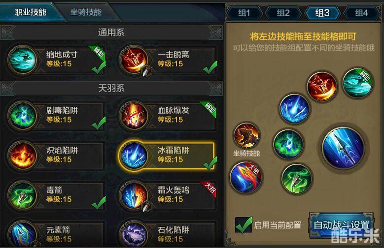技能与山海经组合:元素喷涌(橙色)、毒箭(橙色)、剧毒陷阱(紫色)、冰霜陷阱(橙色)一击脱离(紫色)、缩地成寸(紫色)