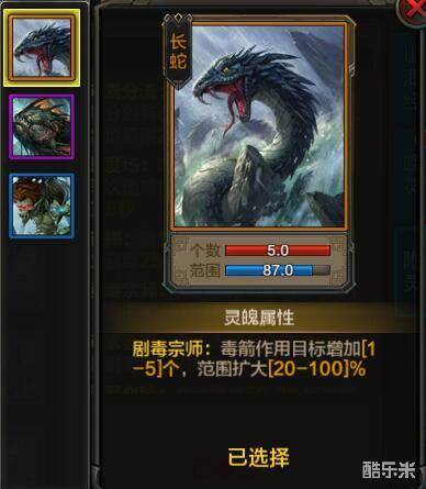 毒箭一开始可以攻击3个敌人,在使用橙色山海经长蛇之后,目标的个数最多增加5个,技能范围最大扩大100%,使得毒箭成为一次攻击8个敌人的群攻技能。毒箭的中毒状态持续8秒,在8秒内持续掉血,并且必定给目标添加剧毒印记。