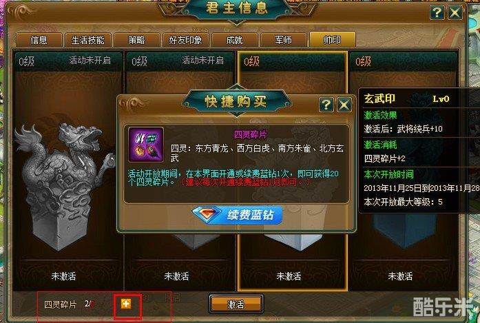 君主帅印已经开启,白虎印和玄武印激活的机会来了,激活帅印可以获得武将统兵加成!!开通蓝钻可以获得激活碎片!