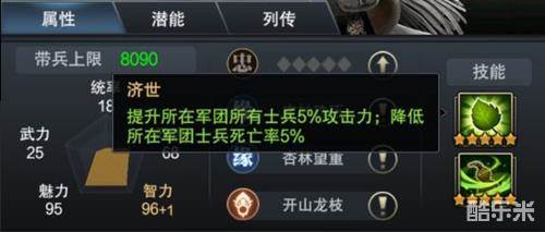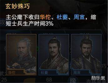 华佗的一大亮点就在于其技能均是面向军团所有士兵的增益。第一个技能“济世”,能提升所在军团所有士兵5%攻击力,并降低5%死亡率。第二个技能“圣医”,能提升所在军团所有士兵5%防御力,并在战斗时降低本方士兵受到的5%实际伤害。虽然说加成系数只有5%,但增益维度较多,可以说华佗是现版本下强力的百搭军团橙将,对于各位主公来说实用性很强。