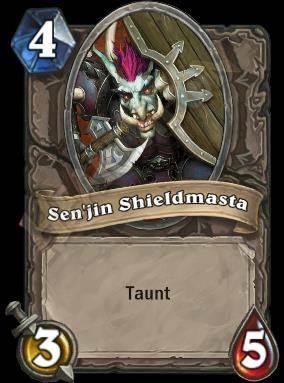 森金村盾牌大师。这是在基础版本中你所能拥有的最好的嘲讽仆从,3/5的身材几乎可以承受同费用所有生物一击而不死。这就意味着对手几乎要用两张牌来去除他。这是我在组拍中一定会保留的仆从,即使你以后得到更多好牌,他也应该是最后被淘汰的单卡。