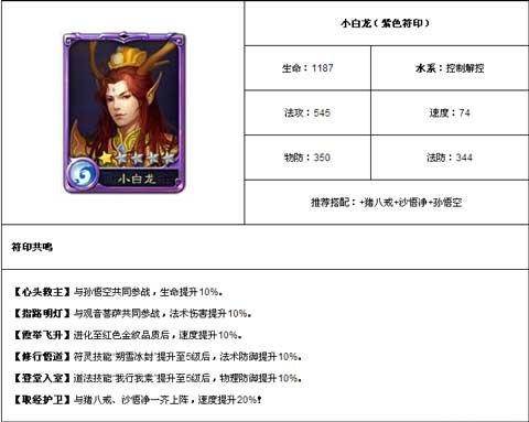 西游神魔决紫色符印小白龙控制解控无解,又是一个在控制着方面很强的符印,虽然没有输出流的符印输出强,但是在控制方面基本上是无人能及的,这个位置是团战中必备的成员之一,他就是队伍进攻的号角,只要控制到对面的脆皮符印,就会一起上将其秒杀,其实就是这么简单。