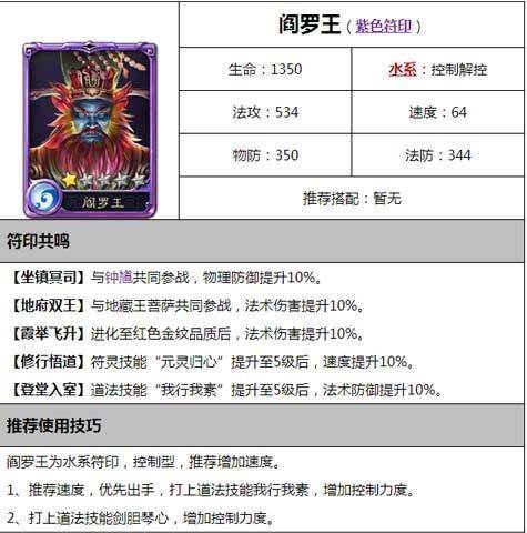 西游神魔决地府统治者阎罗王基本属性介绍,这种符印已经到了这种等级了,想要有更好的发展也是很困难的,基本上也是没有机会的,但是拥有这个复印的玩家也不要放弃他,在前期没有橙色符印的玩家也是可以用的,主要就是能给我们增加控制和伤害,但是因为速度较快,只要不被控制住就很难死亡的,就像小鬼一样让你不得安生。