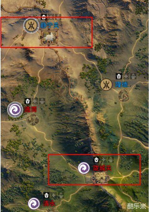 在这里呢我就给新人和散人朋友们划分一下战区,我觉得在陇城关和静宁关没有出现丢失的情况下可以大致分为三个战场已方前线、己方后方、敌方后已方前线