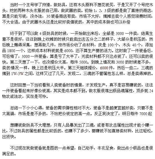 本人不是职业玩家,玩游戏只为悠闲,最开始看到别人卖的40,50装备,感觉价钱都很高,那时我就暗暗决定:以后装备自己打造,不让别人给黑了
