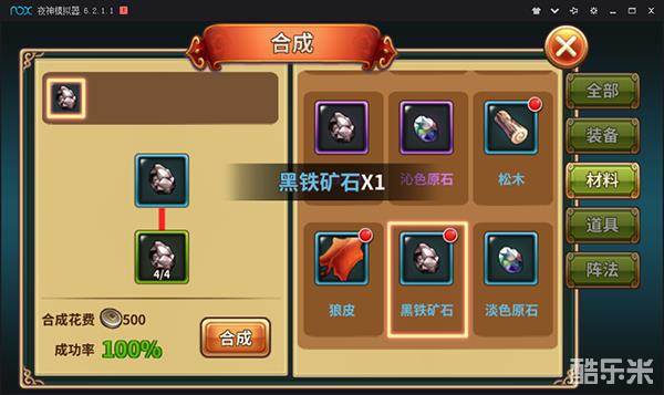 如果满足了合成公式内的全部物品,那么可合成的物品右上方会有红色的合成提示。点击该装备,然后点击合成图标,就可以成功合成啦!O(∩_∩)O下面,本巴豆妖就要为各位合成一枚黑铁矿石!(快夸我快夸我快夸我!#^.^#)