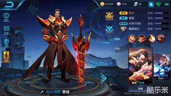 对于新手来说,曹操这个英雄比较容易上手,操作简单暴力,容错率较高。其英雄本身也有自身的优势,一技能的三段位移以及三技能血量的恢复都使得曹操成为强力战士之一。