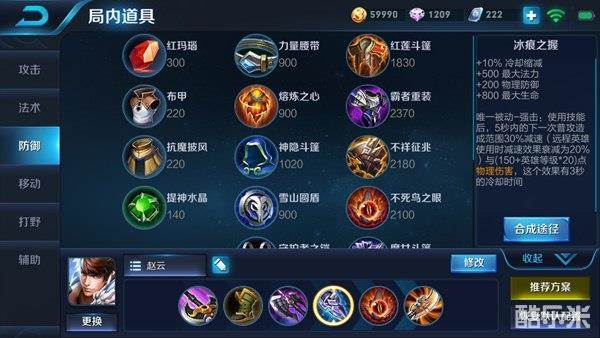 出装思路:召唤师技能选择惩击可以出巨人之握,在前期通过击杀野怪叠加装备被动增加血量,并且被动献祭能够补充对敌时需要的伤害。在鞋子装备上首选影忍之足,被动是减少15%普通攻击伤害,配合赵云自身的被动免伤,能形成强大的防御能力。暗影战斧是一个唯一输出装备,这个装备不仅有15%的冷却缩减,还有几率对敌方造成减速,加上提供的物理穿透属性,完全可以胜任赵云中期的输出。接下来一般出冰痕之握,搭配暗影战斧可以达到25%的冷却缩减,可以使赵云连贯的使用技能,有着免伤效果的赵云甚至能在团战中打出两三套技能。出不死鸟之眼的意义在于他提供的法术防御,而且被动让赵云能更快恢复血量。最后一件装备可以根据对面阵容选择,若对面输出过于强大建议出贤者的庇护,意在团战中更多的输出。反之出破魔刀,提供的物理攻击以及被动能在切入敌方后排时对敌方造成伤害的同时提升生存能力。
