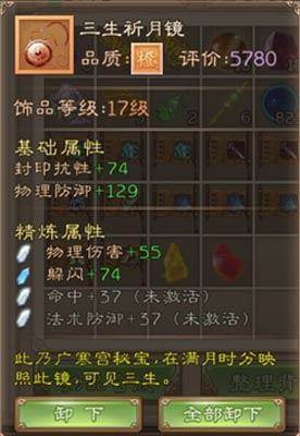 小编总结:这个饰品是广寒宫的秘宝,在满月时分应照此镜,可见三生,基本属性是增加防御的,但是玩家精炼之后他们的影藏属性就是增加一定伤害和躲避了,对战时候很实用的。