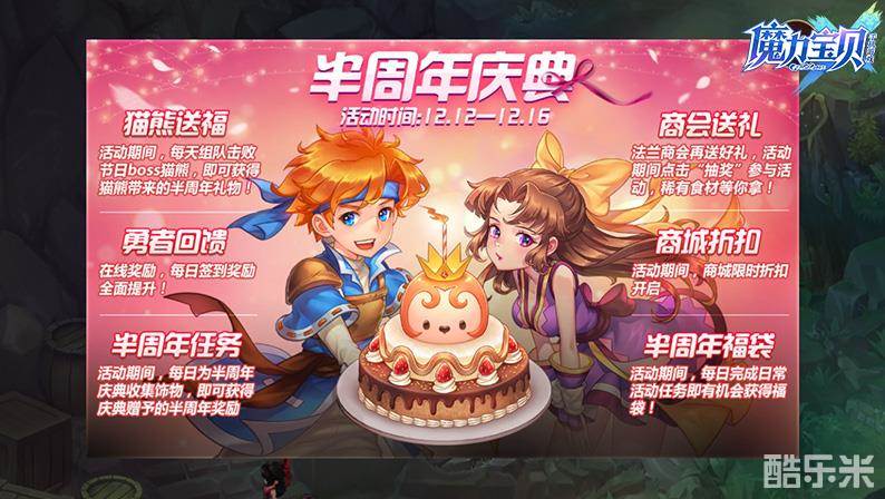 半周年庆典即将来临,全新版本中勇者们将迎接更高的挑战。同时,《魔力宝贝手机版》也在半周年期间上线诸多惊喜福利活动,熊猫送福——每天组队击败熊猫,即可获得熊猫带来的半周年礼物。半周年期间,每天完成日常活动即有几率获得半周年福袋。每天为半周年庆典收集饰物,即可获得庆典赠与的半周年奖励。同时,半周年版本开启时,勇者在线奖励,每日签到奖励将全面提升!商城折扣、法兰商会活动限时开启!海量福利即将来袭,敬请期待。