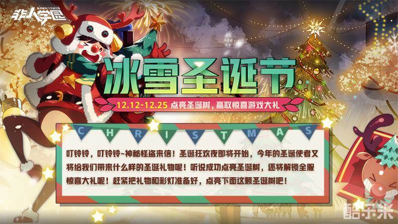 冰雪圣诞节将至,《非人学园》圣诞狂欢夜欢快来袭。在这个欢快的节日里,学园收到神秘怪盗来信,透露出圣诞使者的信息,给节日氛围加入了一丝神秘惊喜喔!12月12日至25日,听说只要成功点亮圣诞树,就会解锁全服惊喜大礼呢。同学们快准备好礼物和彩灯,一起迎接这一年一度的盛大庆典吧!