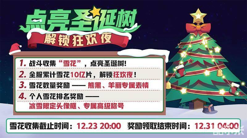 自12月12日更新后至12月23日20:00,同学们只要参与排位赛、匹配赛的战斗,就能获得神奇道具“雪花”。随着全服玩家一起积攒雪花,圣诞树将会逐步点亮。全服累计雪花数量达到2.5亿、5亿、7.5亿时均可解锁全服奖励。活动时间内全服累计雪花达到10亿片,还将揭开怪盗真面目,在12月24日、25日晚,为全服玩家带来平安夜大狂欢喔!神秘时装表情、合同文本,以及熊黑、羊丽特别时装,流光四溢的冰雪头像框、冰雪圣诞主题称号等一大波丰厚奖励等你赢取!