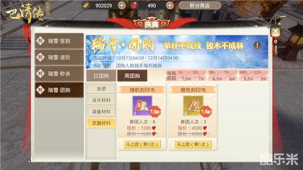 在双12期间,我们还将开启“瑞雪·团购”活动。在活动期间,玩家可以在团购界面,团购自己所需的道具,参与团购的人越多,所获得的折扣越高。当团购人数达到125人时,可以用极为优惠的折扣价格兑换高级橙色刻印、龙渊宝鉴等珍稀道具!