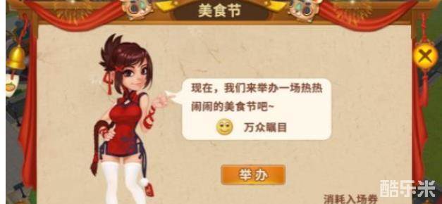 当游戏达到一定等级后,通过建造建筑“美食广场”,就可以举办美食节了,举办美食节需要消耗入场券哦~消耗入场券之后,点击举办按钮即可开启美食节。每次会随机抽取3张你拥有的的主题,选择一个作为本次美食节的主题。