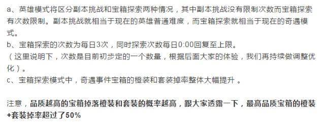 英雄模式的奇遇宝箱掉率低的问题,以及整个后期玩法少的问题,我们在12月中旬,就通过一曲斜阳、天线党大宝、悍匪等几个早些到达后期的玩家反馈发现了问题。但开发速度确实没有达到大家预想的那么快,所以紧赶慢赶能让它在这周上线内测专区。