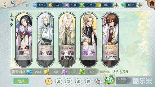 在茶灵编队界面,每只队伍最多可以编排5个茶灵作为主力共同作战,另外在战斗中还可以至多解锁和选择三个援军帮助作战,援军茶灵主要来自好友以及陌生人的茶灵。雅士想要提升茶灵编队的战斗力,除了看每个茶灵的茶性,还可以在选择主力时,根据盘茶属性匹配合适的茶灵。每一个茶灵都有与之匹配的三个盘茶茶灵,当选择编队主力时,如果同时选择了具有盘茶属性的两个茶灵,在战斗中茶灵的攻防属性都将会大大提升。