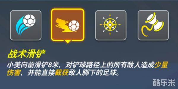 小美向前滑铲8米,对铲球路径上的所有敌人造成少量伤害,并能直接截获敌人脚下的足球。