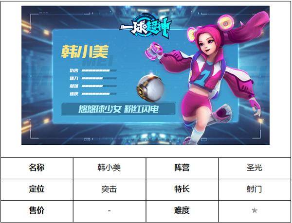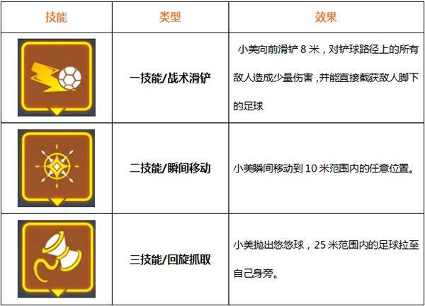 小美是一个在场上非常灵活机动的突击手,擅长防守反击打快攻,属于团队冲在最前的前锋。小美技能操作简单,非常推荐新手使用,但因为血量实在太少,非常容易死,所以千万不要参与到混战中去。