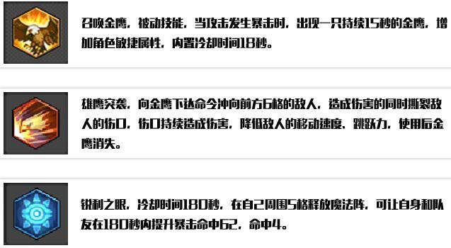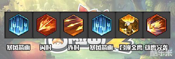 输出循环为:暴风箭雨,持续闪射至蓝量较低时使用连射,之后暴风箭雨卡住CD使用即可,召唤金鹰持续时间快要结束时使用雄鹰突袭,如此循环。
