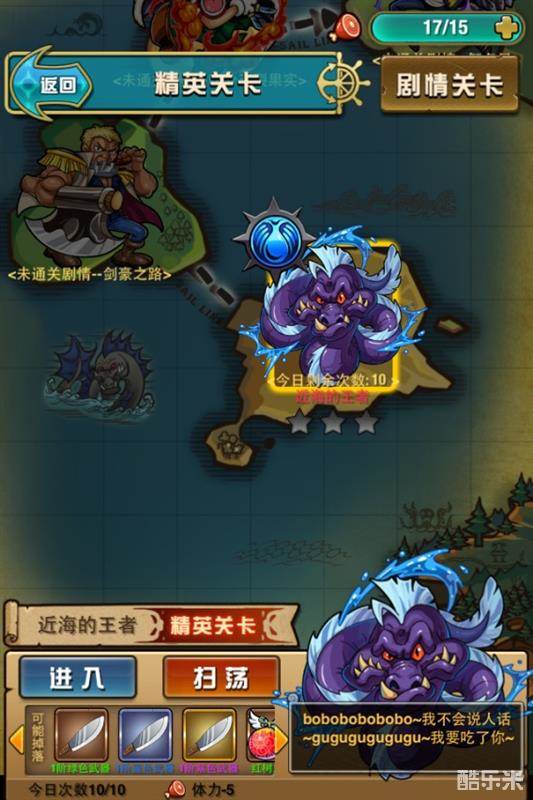 《谁是海盗王》的关卡类型,分为四种:剧情关卡、精英关卡、活动关卡、多人关卡。