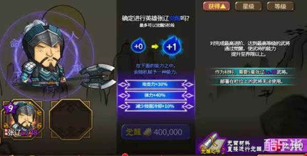当武将进阶至最高等级后,会出现【可觉醒】字样;觉醒条件为相同武将且满级。