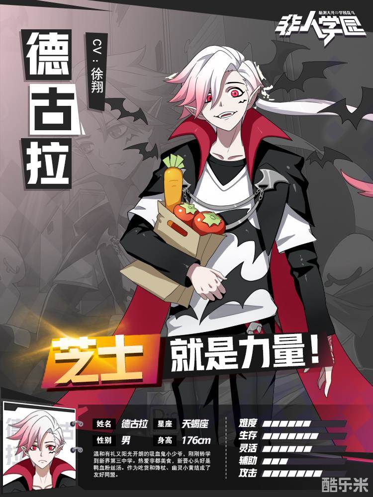 德古拉,男,16岁,天蝎座吃货吸血鬼,热爱非都美食的奶狗歪果仁。初见是温和有礼又阳光开朗的小少爷,擅长卖萌的交友达人,转学到三中后到处交朋友。而熟识后的德古拉,资深吃货一面暴露无遗,喜爱谈论美食,随身携带装满食物的纸袋,以及因为种族而对血液的渴望,吸血能提供持久的饱腹感,对他进行投喂可以快速提升好感度。德古拉肚子太饿时会驱使它们撮一点动物的血液回来哺给。