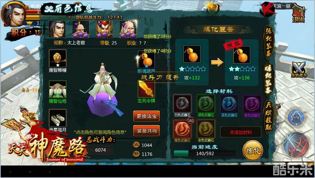 操作:1、点击【角色】-》2、选择要强化的角色-》3、选择要强化的装备-》4、【炼化装备】-》5、不同颜色的材料可以获得不同的升阶点,点击材料可添加-》6、升阶点满后点击【开始炼化】