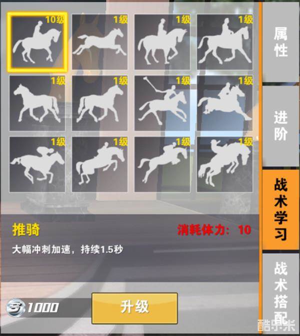 本期我们将详细讲述游戏内重要的技能玩法战术,战术可通过银币来进行升级每个技能升级之后所带来的收益是不同的,并且只能在比赛开始前在战术搭配中进行修改,各位玩家如果想要更换或升级技能都需要在骑师培养战术学习或战术搭配中进行调整,技能等级越高所带来的收益也就越高,我们在本次攻略中推荐各位玩家可以首选升级推骑和加速这两个技能,其他的减速以及左右移动技能需要熟练的骑师们驾驭,萌新玩家们还是先从速度上入手争取碾压对手吧~