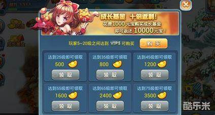 1、成长基金在游戏中是一个很重要的系统,等级的不同获取的元宝数量就不一样。元宝可以在游戏中,购买玩家需要的道具来增加自己的战斗力,是一个很实用的系统。