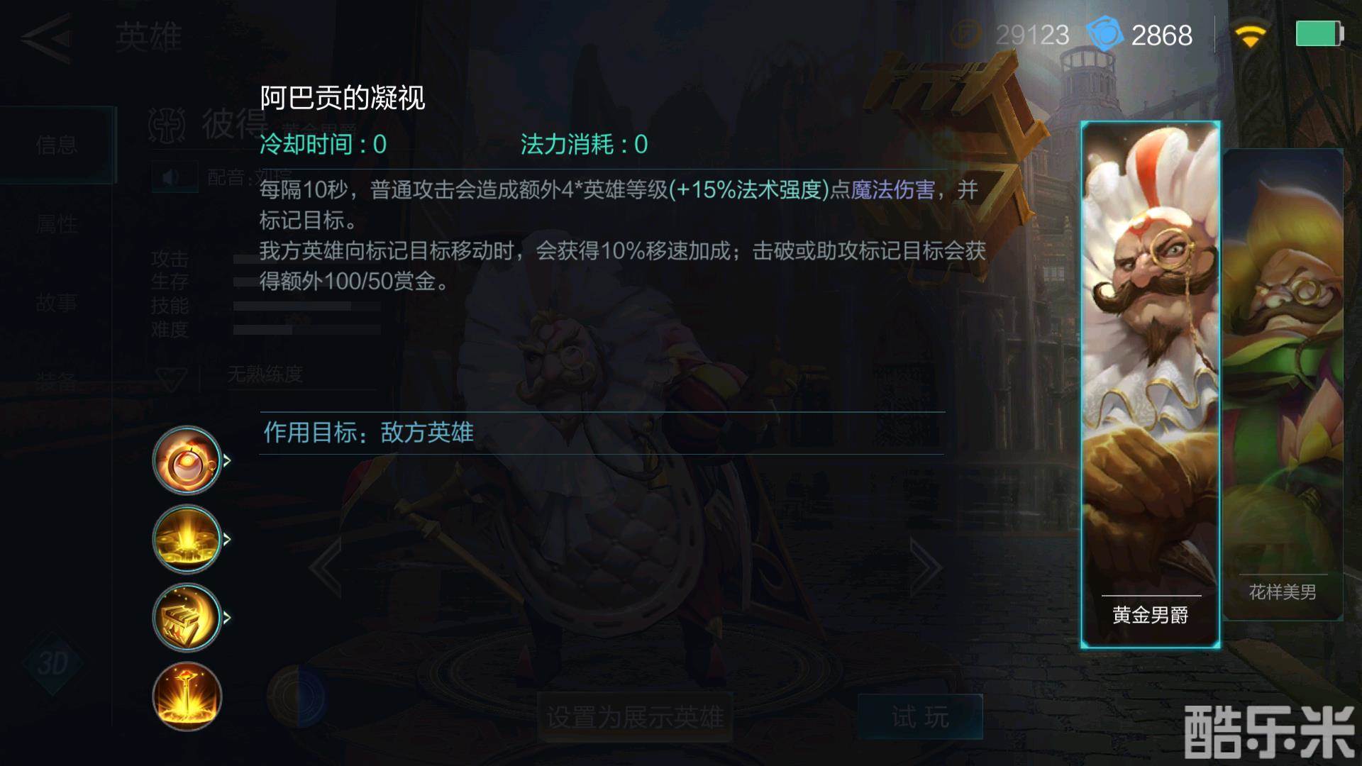 每隔10秒触发一次被动对目标造成额外伤害且对目标进行标记,如果友军向目标方向移动会有移速加成同时击杀或者助攻该目标都会有额外的金币加成。这个被动给彼得自身以及队友都带来一定的增益,合理使用非常无解。