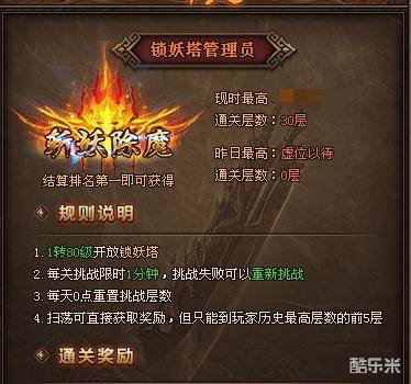 当人物等级达到1转80级就可以进入地图参加活动,锁妖塔每关挑战限时1分钟,挑战失败可以重新挑战,每天0点重置层数,扫荡可直接获得奖励,但只能玩家历史最高层数的前五层。