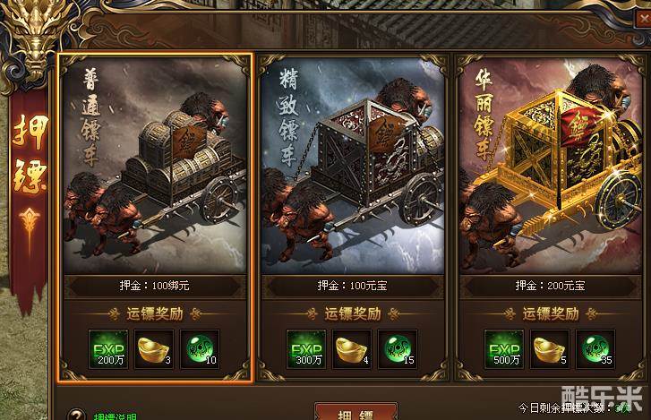 我们将镖车从比奇城的押镖押送到盟重省的王城将军处,奖励大量经验,绑元和玄武灵力。镖车等级越高,奖励越丰厚,打劫他人镖车,根据不同等级镖车掉落不同数量元宝。