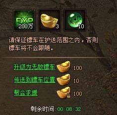 在押镖过程中可以将镖车升级为无敌镖车,需要花费100元宝。在押镖途中,万一跟丢了镖车,不用担心!花费10元宝马上就可以传送到镖车位置,很是方便的!遇到困难记得花费100绑元帮会求援呐!
