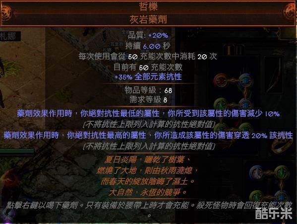 在这里隆重介绍一下哲栎药剂.我的装备搭配全抗在藏身处141%.哲栎药剂喝下去有造成全元素伤害穿透30%.受到全元素伤害减少15%.就一个字厉害.