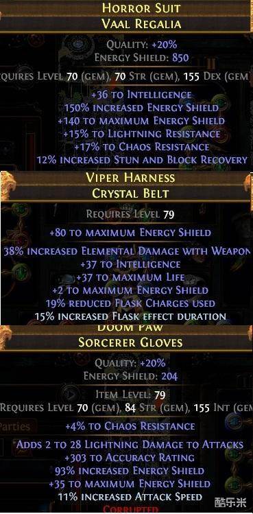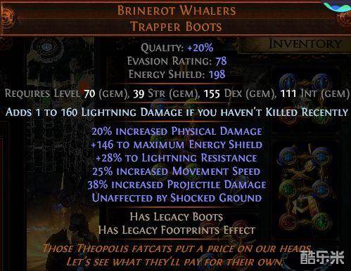 这个鞋子中文名不知道叫啥。。。近200的ES,25%跑速,20%物理伤,近40%投射伤,还免费附赠闪电抗,我不知道还有什么能要求的,关键便宜啊!C货!