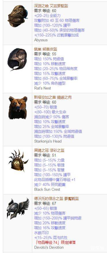 【黑阳之冠】:提供力量也处理了缺敏捷和智慧的问题,但是没有生命和抗性,并且这个头盔要买到“+3【熔岩打击】投射物”附魔的比较有难度。