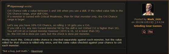 简单翻译下:基佬A:(前略)也就是说,如果我暴击几率是10%,然后爆击roll到了12,那么击中目标我的攻击就不会产生暴击;但是如果怪物受到了暴击诅咒,增加5%受到暴击几率,那么他的暴击门槛就变成了15,因为12<15所以这个被诅咒的怪物就会受到暴击。